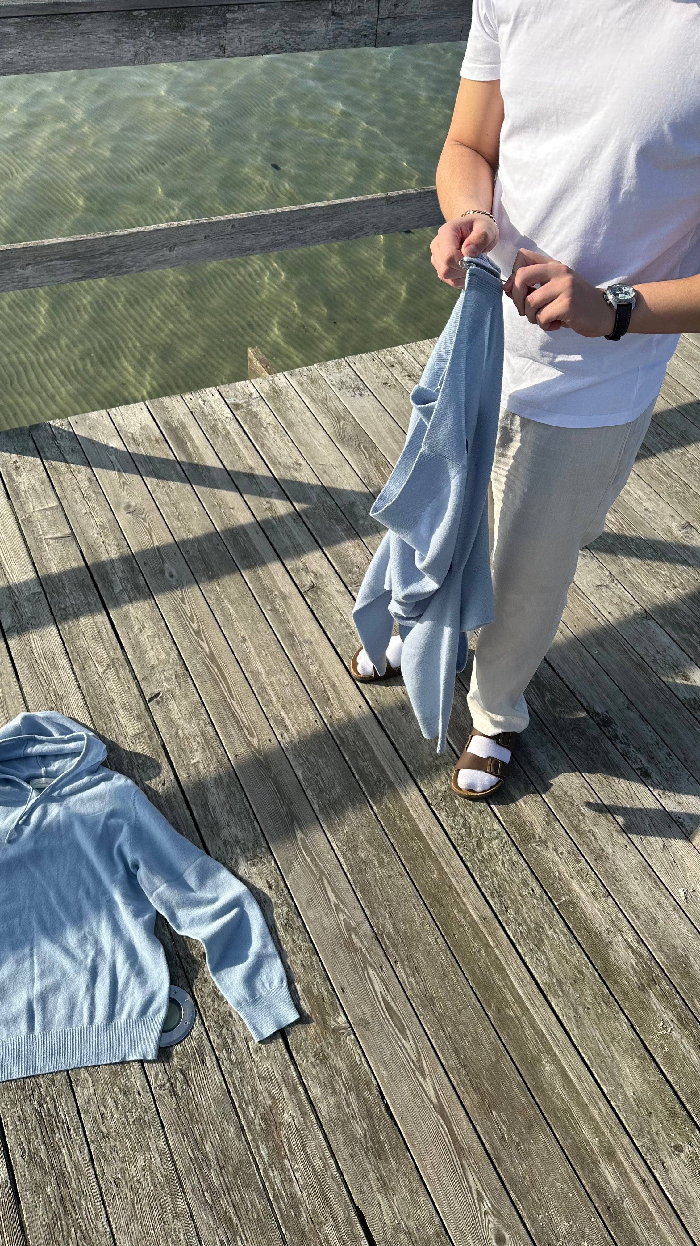 Upptäck vår Marinblå Kashmir Hoodie, en perfekt kombination av tidlös design och premiumkvalitet. Den är skapad i regular fit med en true-to-size passform för att ge en bekväm och elegant look. Tillverkad av högkvalitativ kashmir som ger exceptionell komfort, hållbarhet och värme. Denna marinblå hoodie är idealisk för vardagsbruk och passar alla tillfällen, från avslappnade dagar till mer stilrena sammanhang. Höj din garderob med denna lyxiga kashmir